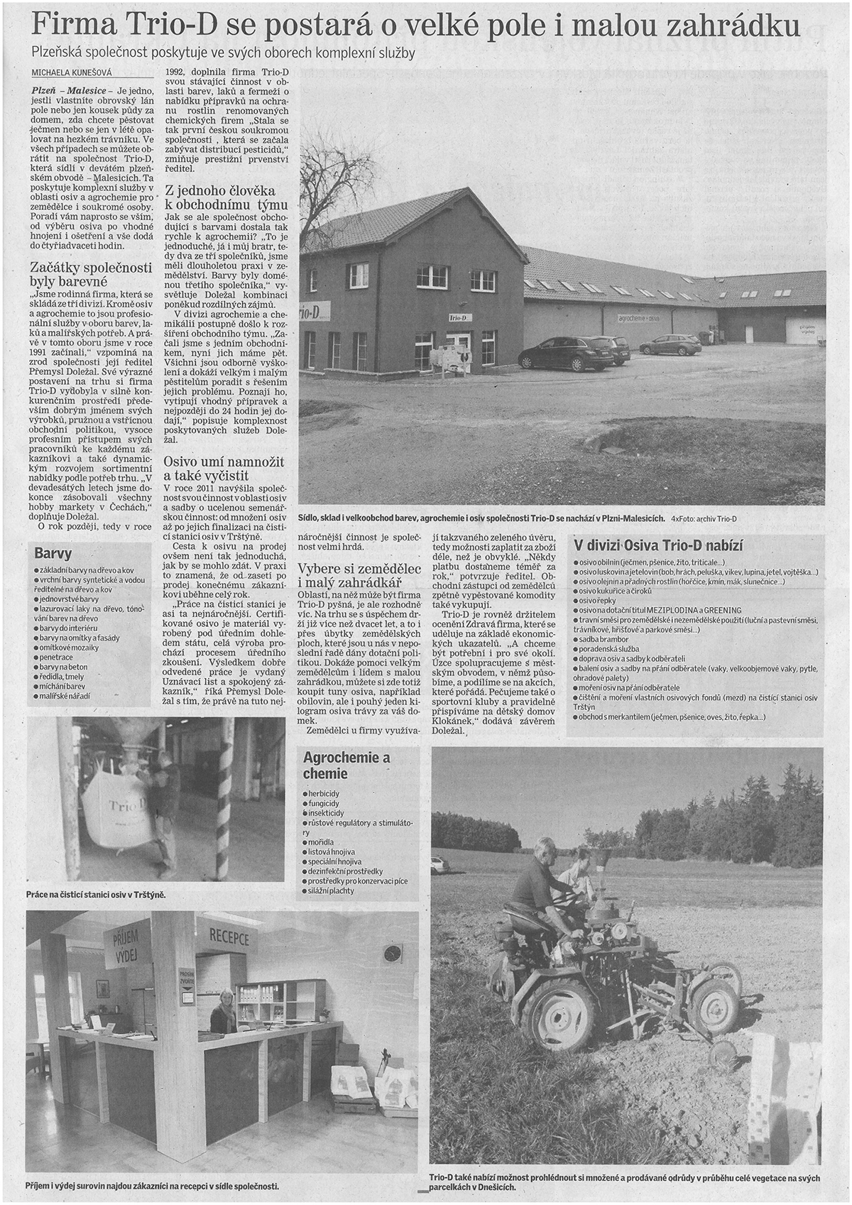V roce 1992 doplnila firma Trio-D spol. s r.o. tuto činnost o nabídku přípravků na ochranu rostlin renomovaných chemických firem. Stala se tak první českou soukromou společností, která se začala zabývat distribucí pesticidů.